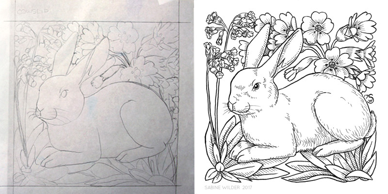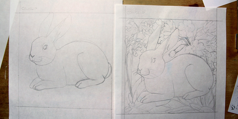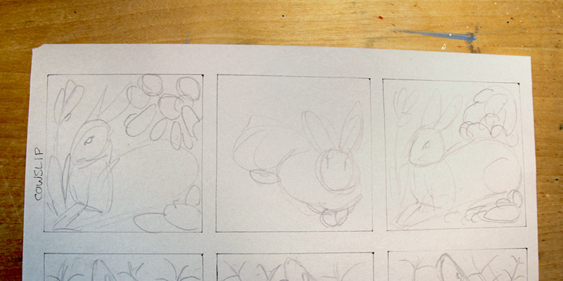 The idea behind the drawings was to draw a series of rabbits with their namesake plant filling up the background. I wanted to fill in a square, leaving the edges defined by the rabbits and plants. In order to see how these ideas would look, I started with drawing thumbnails of rabbits in different positions. Though my first drawing for Cowslip stuck.