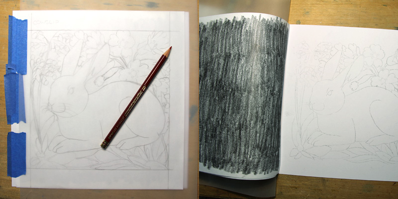 I transfer my sketches onto a thicker bristol paper by tracing them over a layer of homemade transfer paper. It's easy to make, just take a soft pencil and cover a sheet of paper about the size of your drawing. I also use a layer of tracing paper on top so I don't ruin the original sketch. I like to use a red pencil so I can see clearly where I've traced. The result gives me a soft pencil outline for inking.