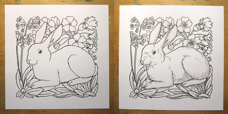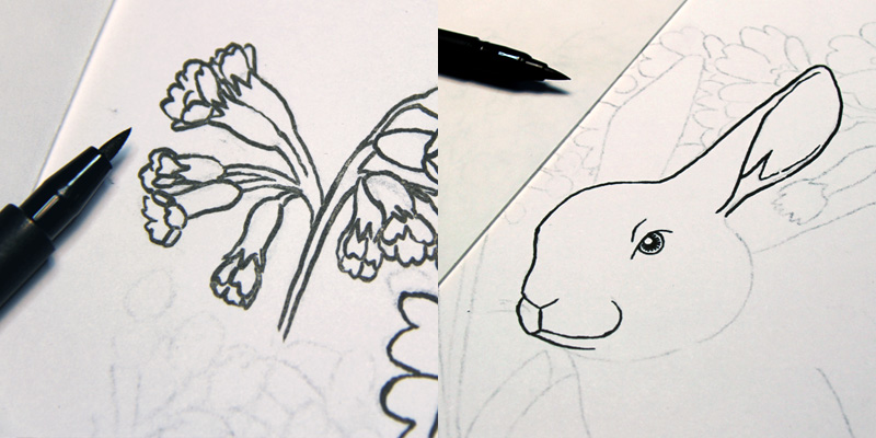 I started each piece by inking the rabbit. They were usually the foremost subject in the drawing and rarely had things overlapping them. I would use my thickest lines for the rabbit's body and then steadily move from the foreground backward into the drawing.