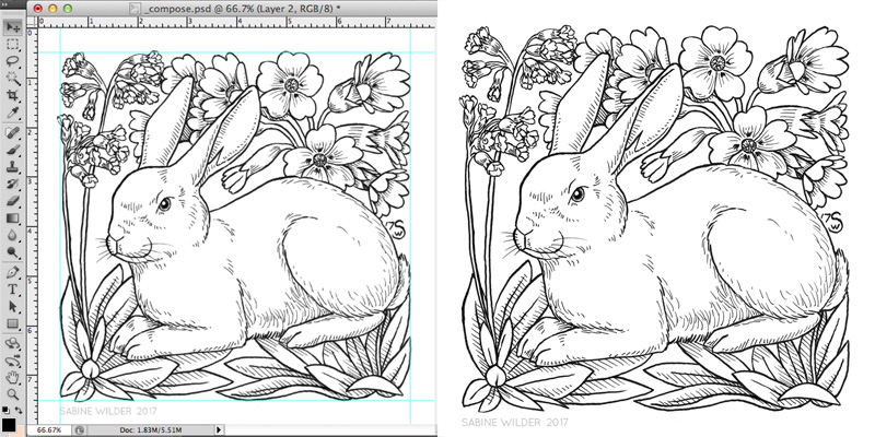 Next I scan and digitally clean up the drawing to get it ready for its online debut. I try to clean up as much of the drawing as possible physically so that the only digital corrections I need to do are removing specks from the scanner and adjusting the contrast and colour of the paper. Then I bring the scan into a Photoshop file with all my presets and a watermark and save it as a jpg optimized for web use.