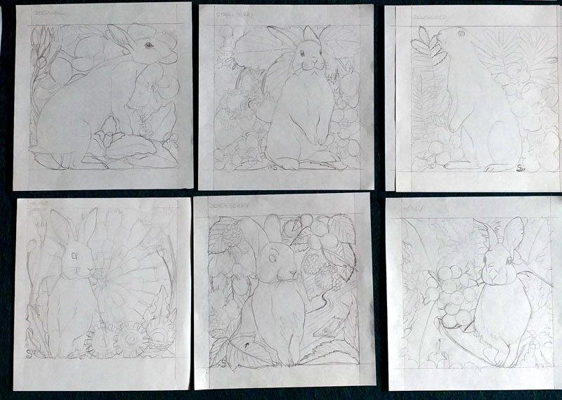 Thumbnails in hand and reference photos picked, I was ready to start drawing. I was excited to start but nervous as well. What if this project didn't turn out? Well, I had lots of time to get the pencil drawings right before I started inking. No problem. I started with Hazel and he took me a few hours. I fussed a lot over him, redrawing the sketch several times, but I was fairly happy with it when I was done. The other rabbits went by much quicker as I got used to drawing the sketches.